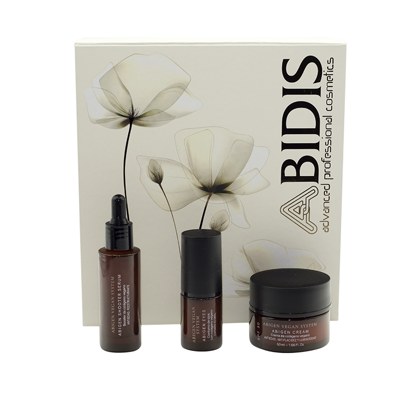 El Pack Facial Abigen de Abidis contiene la cosmética antienvejecimiento global a base de colágeno vegano tipo I y III, cuatro tipos de ácido hialurónico, bakuchiol, vitamina C estabilizada y Oligopéptidos.